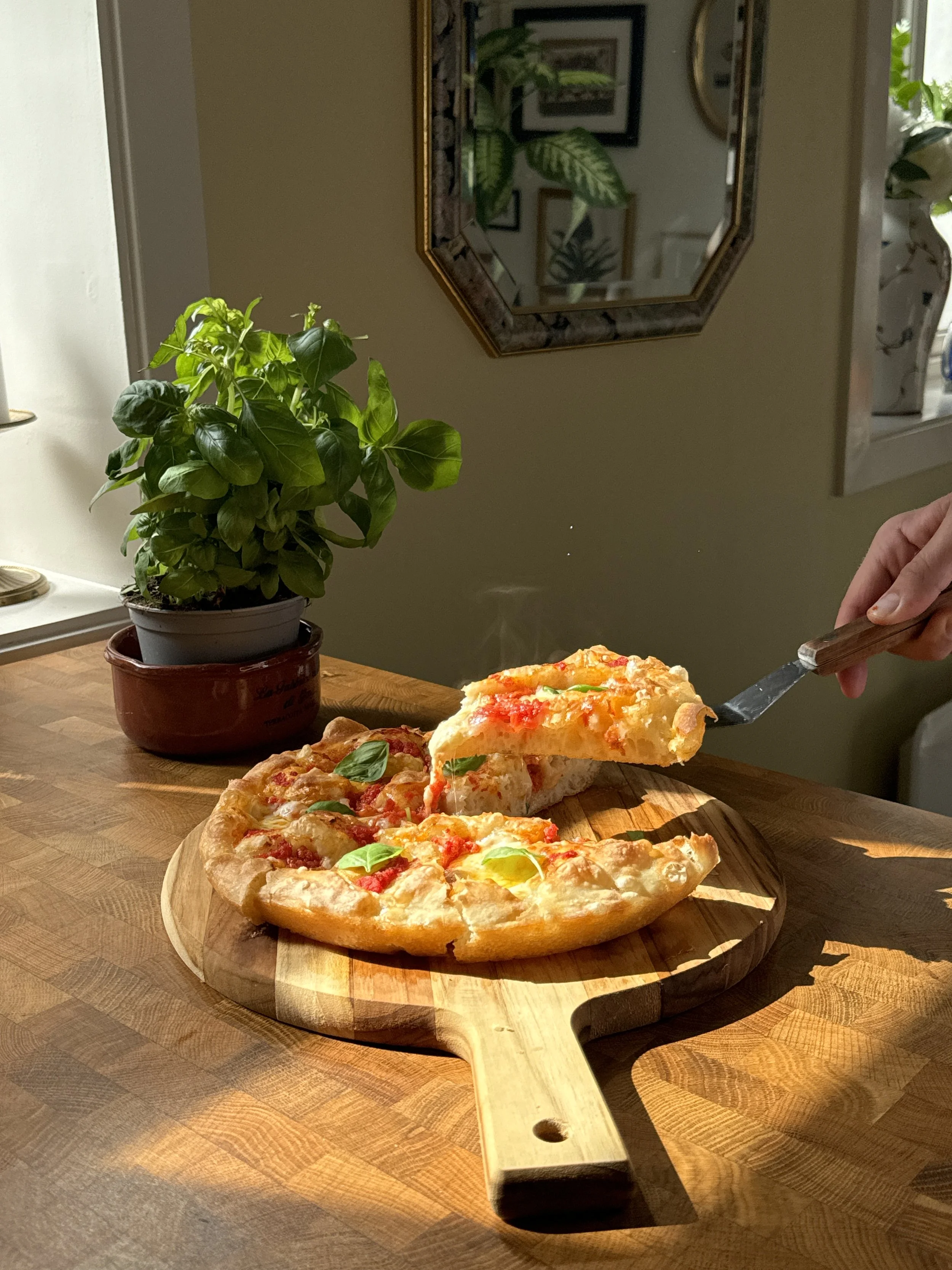 Løft pizzaen forsiktig over på en fjøl. Topp med basilikumblader og skjær opp.