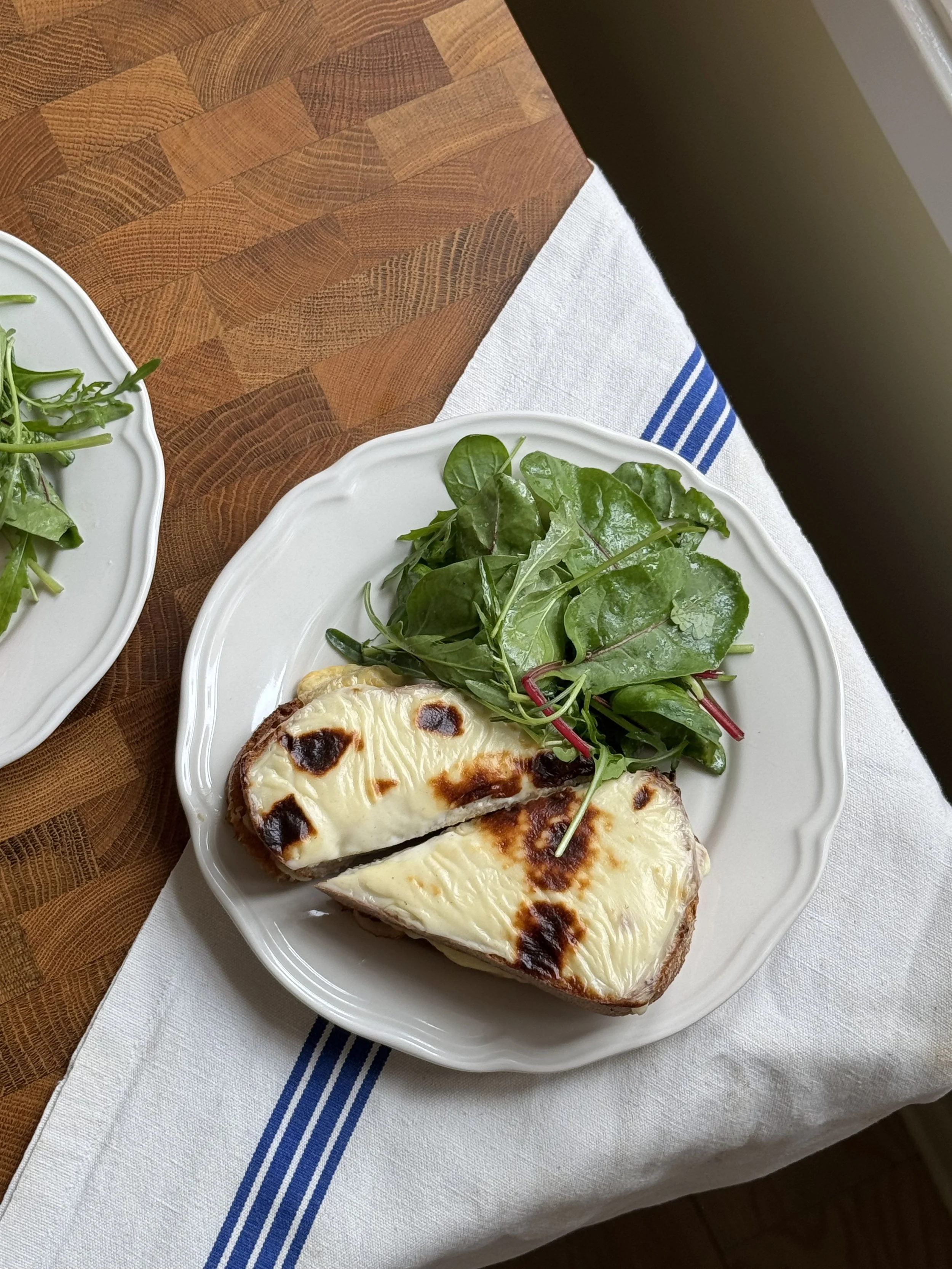 Verdens beste ostesmørbrød! Grunnen er at osten ikke bare befinner seg mellom skivene, men også oppå, i form av en feit ostesaus. Når smørbrødet gratineres i ovnen, vil ostesausen på toppen boble og få mørke flekker, omtrent som en godt stekt lasagne. Ikke hverdagskost.