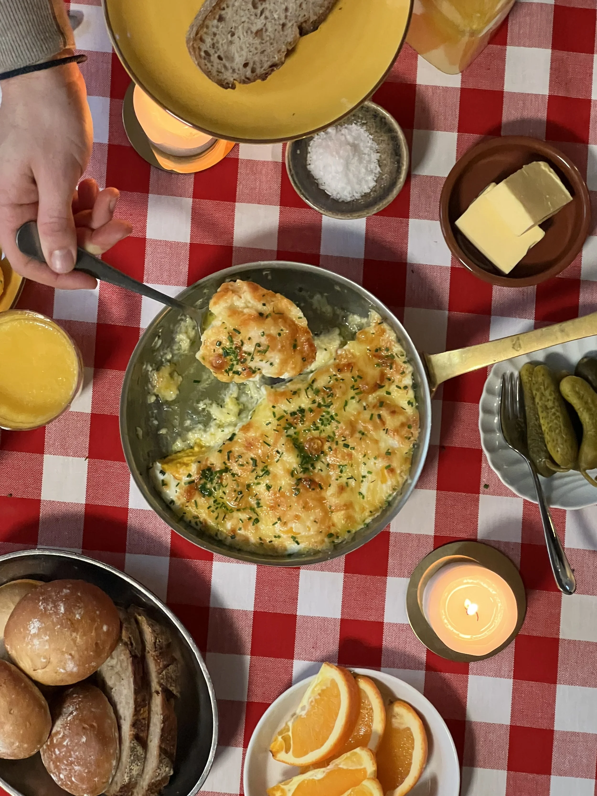 Dette er en enkel måte å få i seg masse ost på. Vi har kalt retten høyfjellsegg fordi det er en kopi av den sveitsiske retten alpine eggs. Perfekt som påskefrokost.
