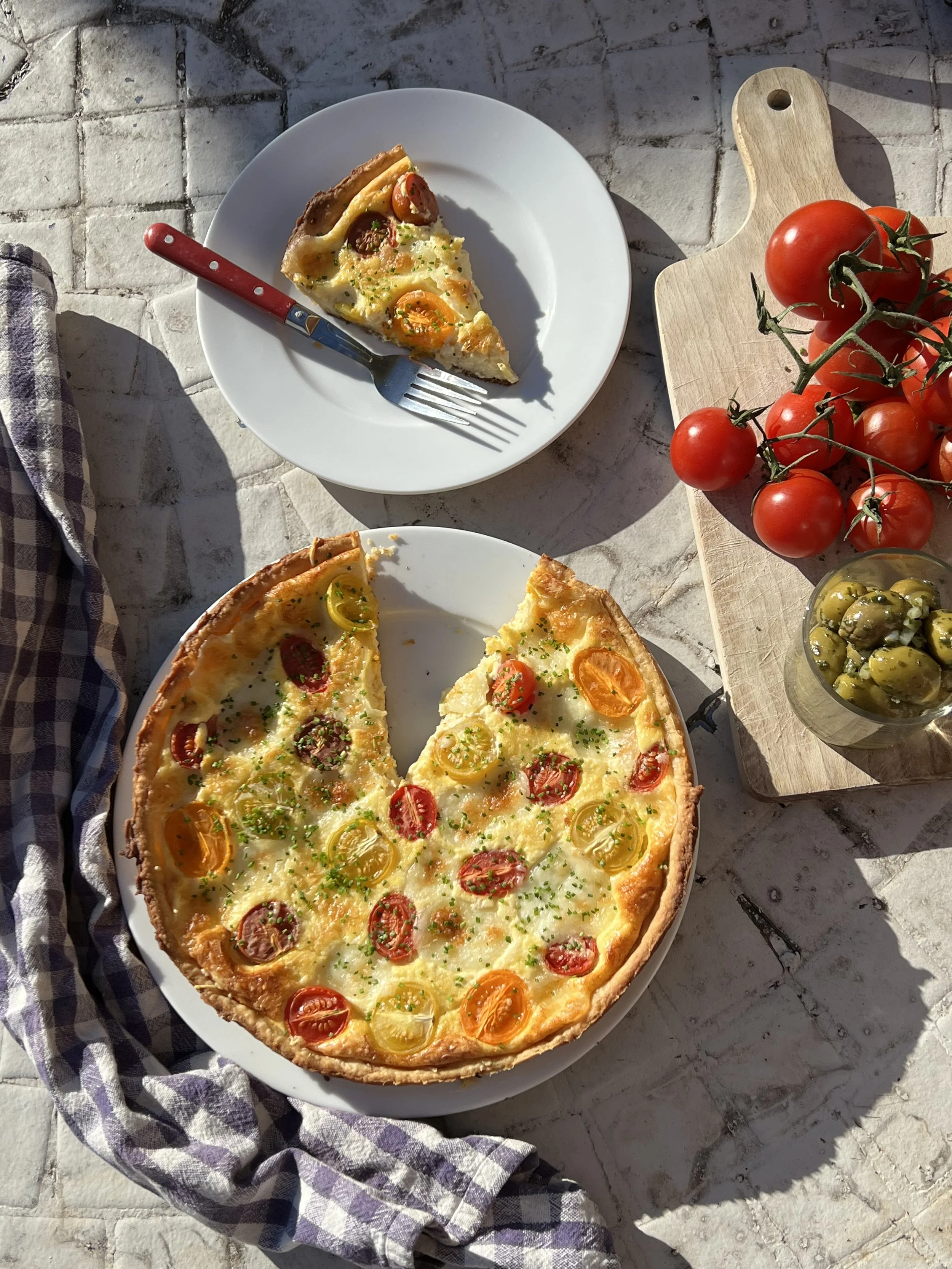Spre osten utover paibunnen. Hell eggeblandingen over. Del tomatene i to og spre dem utover paien. Topp med biter av mozzarella.
