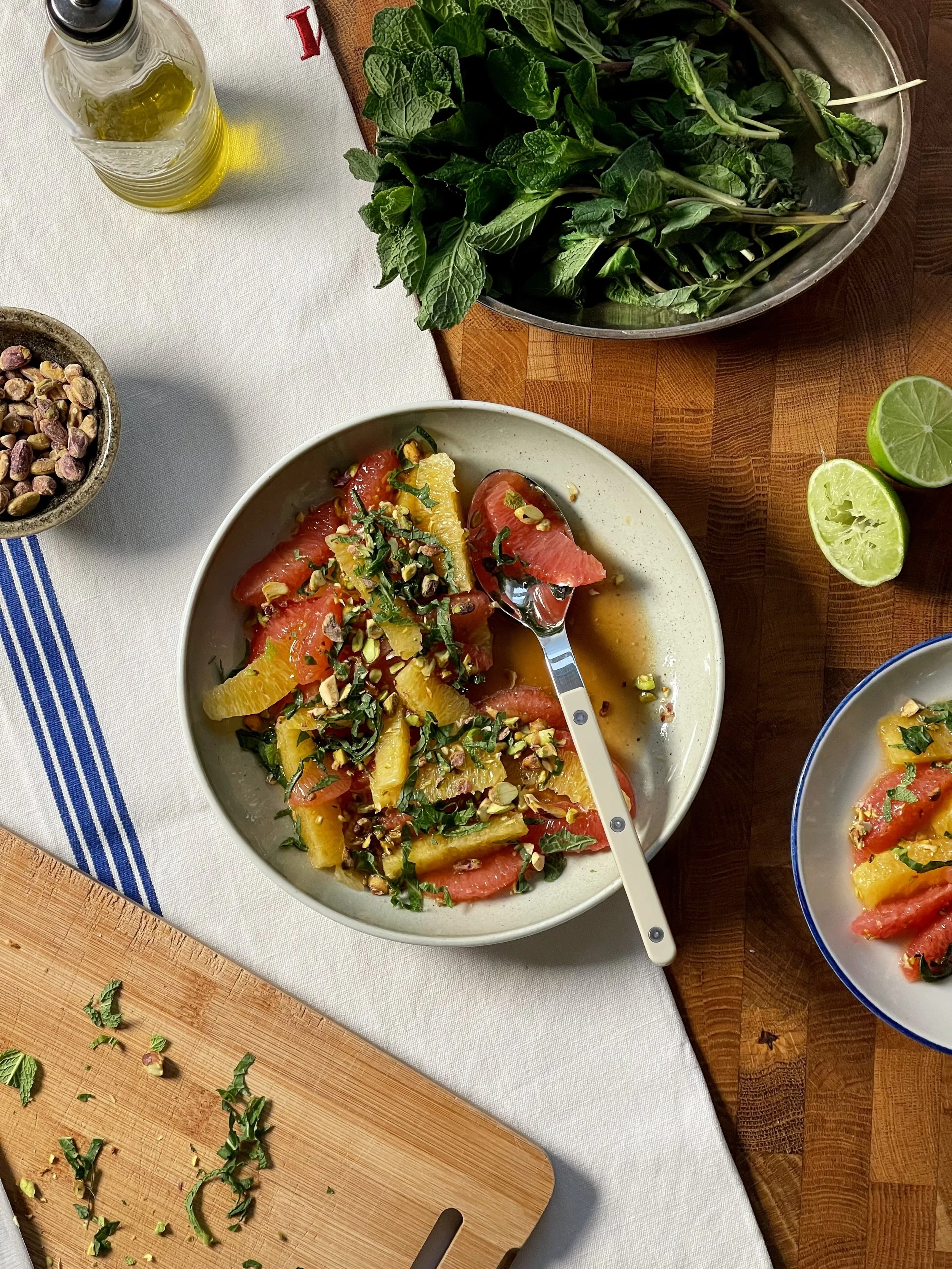 Denne sitrussalaten er like god som dessert som til frokost, servert med gresk yoghurt. Mynten du finner i vanlige matbutikker er ofte pistrete og smakløs. Gå til en frukt- og grønthandler, hvis du kan.