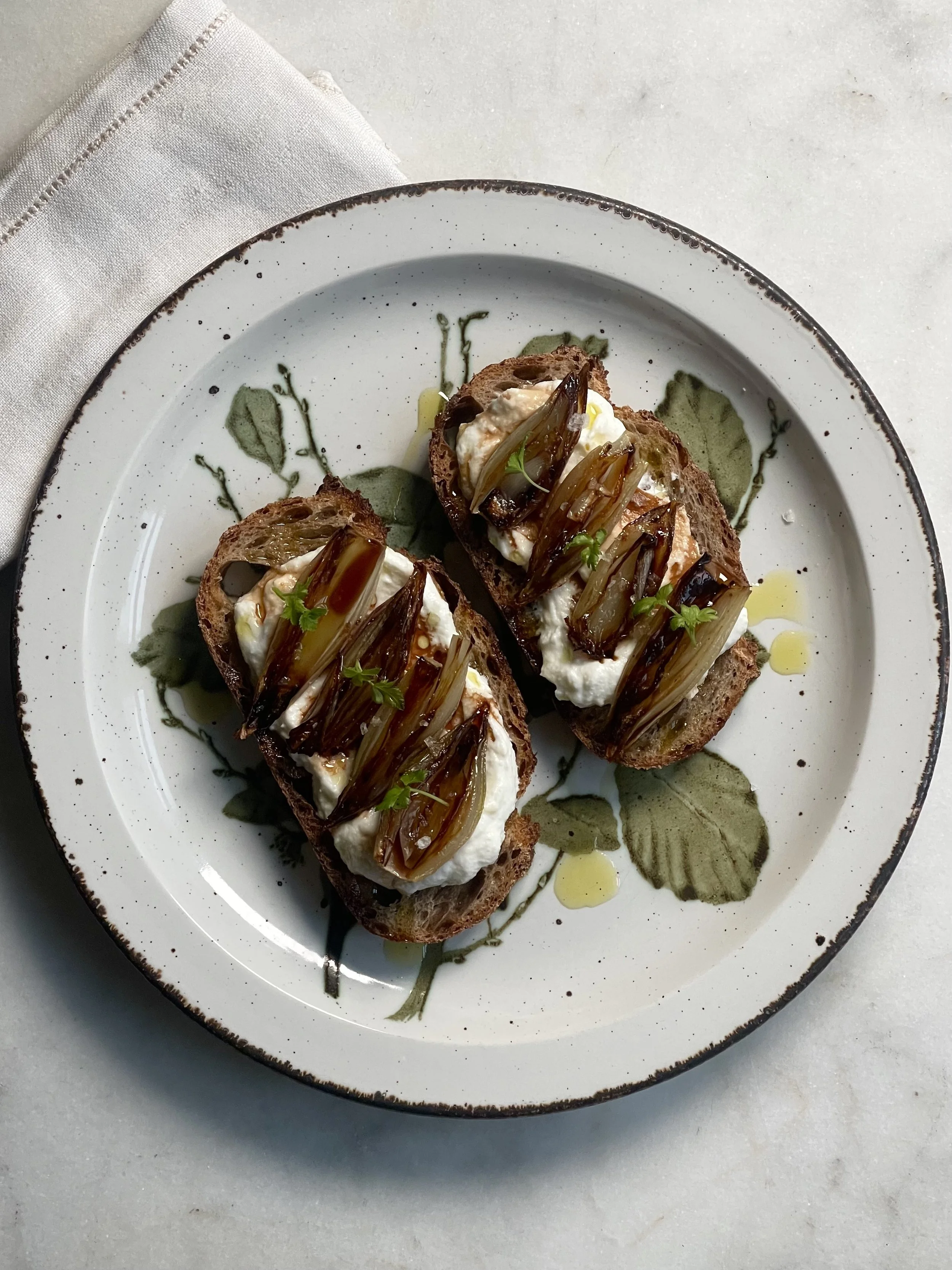 Når sjalottløken bakes, blir den myk og søt. Den trenger noe friskt og syrlig – her i form av pisket ricotta med sitron og dråper av balsamicoeddik. Hvis du vil servere denne retten som en liten snack før gjestene setter seg til bords, kan du bruke skiver av baguett i stedet for surdeigsbrød. Da blir porsjonene mindre og mer håndterlige.