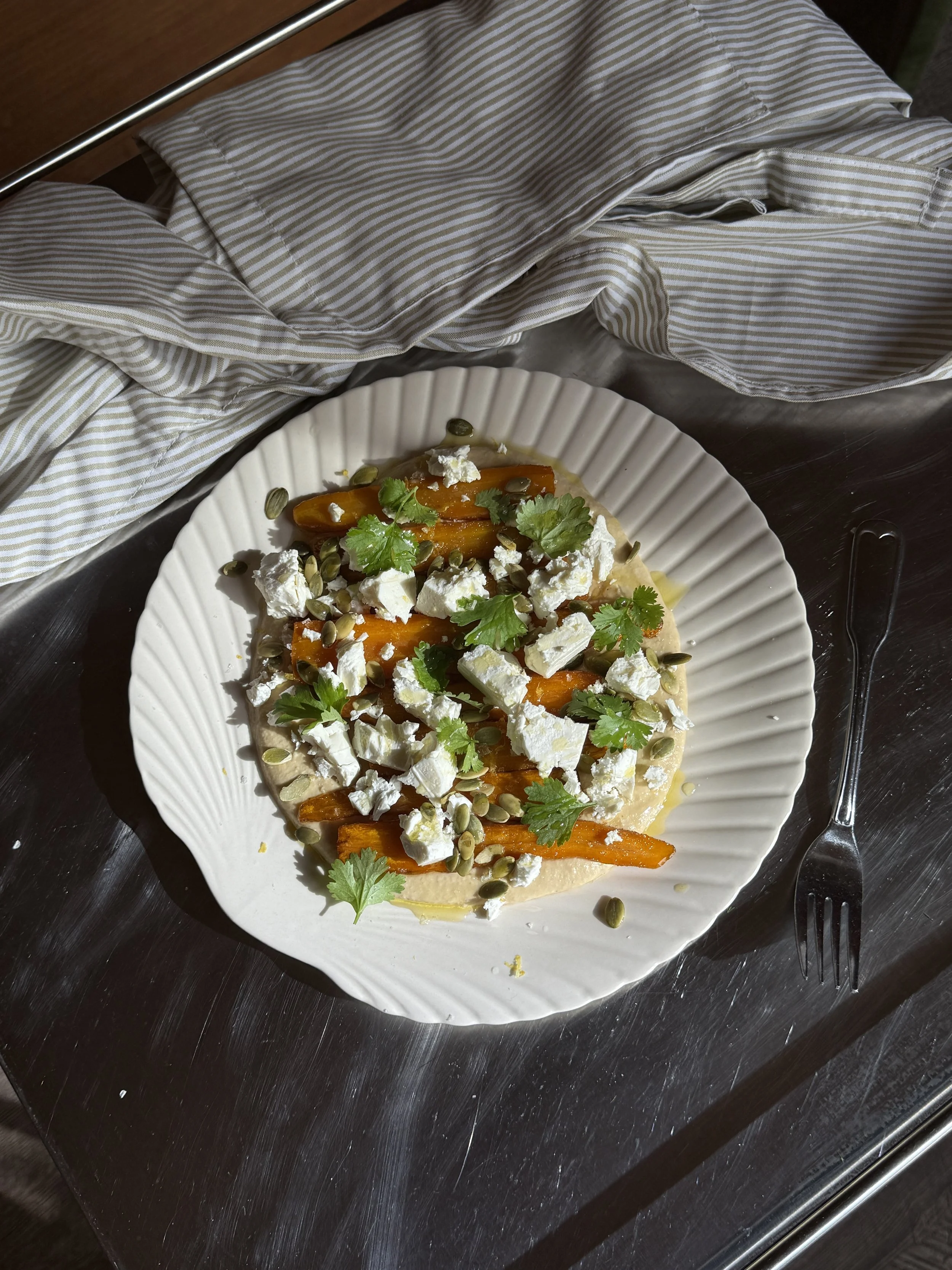 Spre hummus utover tallerkenen. Legg de bakte gulrøttene oppå. Ha på litt sitronsaft og sitronskall. Topp med feta, gresskarkjerner, koriander og olivenolje, kanskje et dryss med flaksalt.