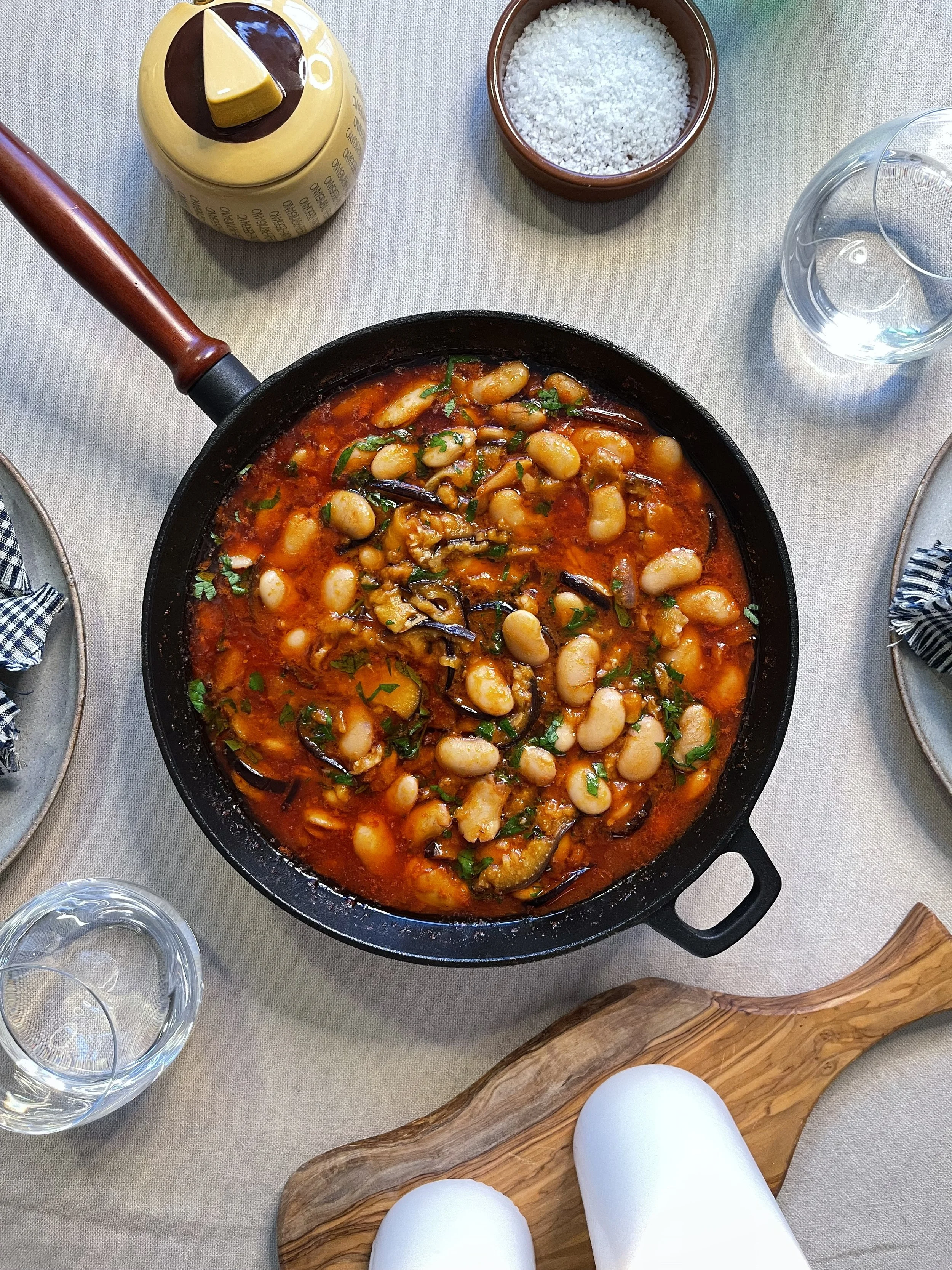 Her lager du hele retten i én og samme panne. Veldig praktisk. Du kan selvsagt leke deg med andre belgfrukter og grønnsaker, hvis du føler for det.