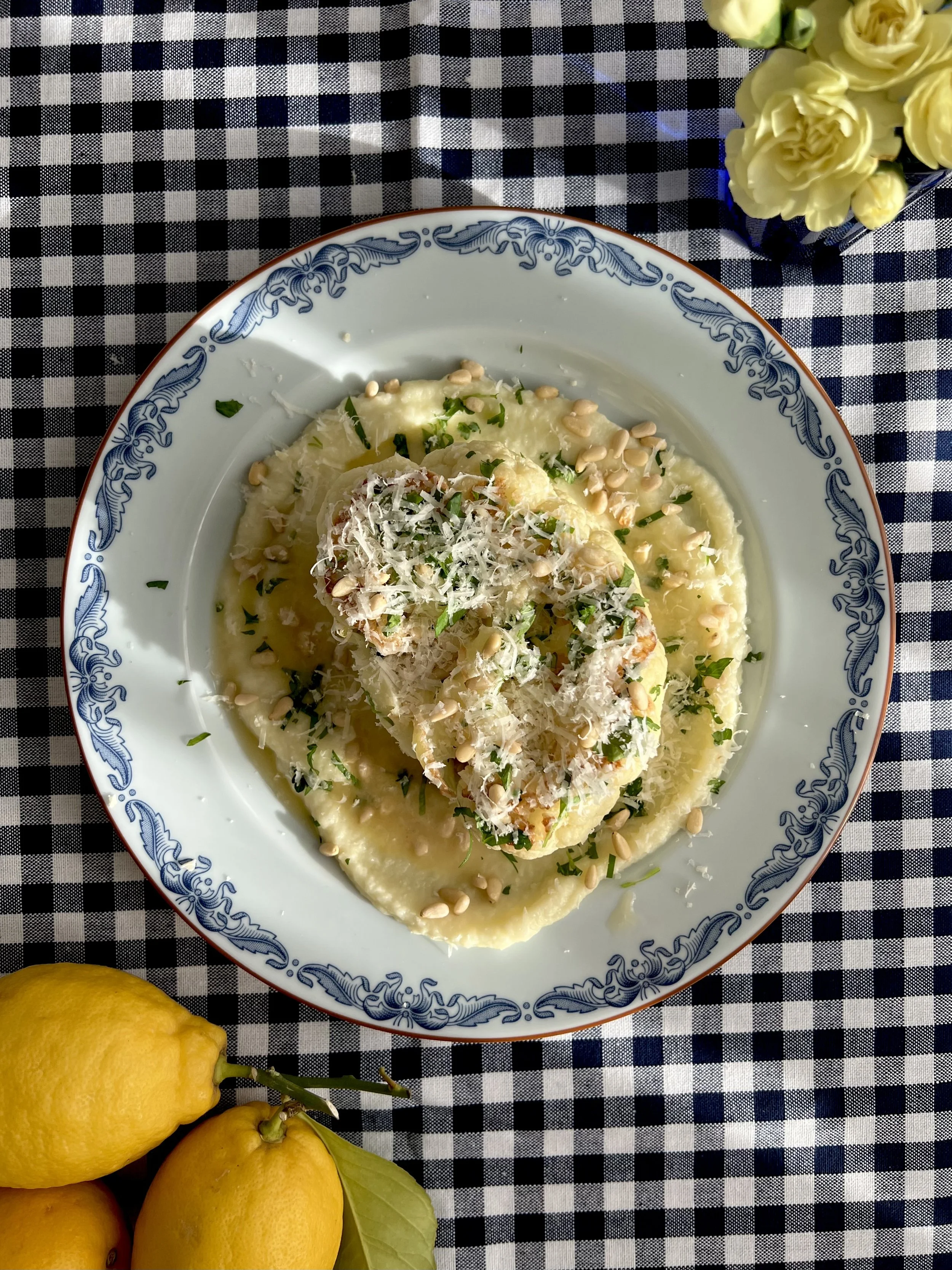 Spre blomkålmosen utover et fat eller to tallerkener. Legg på blomkålbiffene. Hell over saus fra panna og topp med parmesan, persille og pinjekjerner.