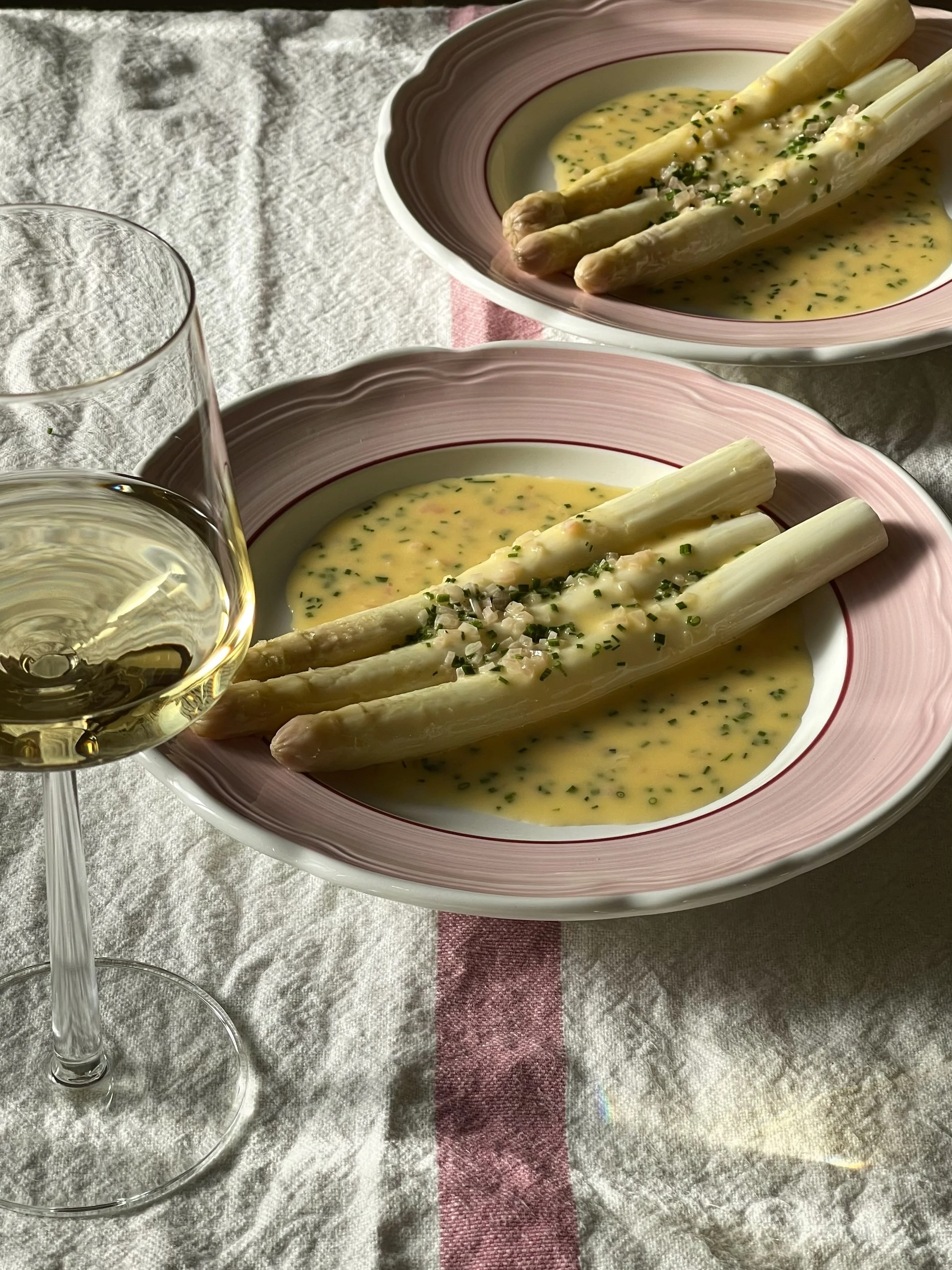 Forskjellen på grønne og hvite asparges er at de hvite ikke får vokse i dagslys. De lever hele sitt liv under jorda, i mørket. Det gjør at de får en søtere og mildere, men samtidig litt bitrere, smak. Her har vi tilberedt aspargesene på klassisk vis og servert dem med en syrlig smørsaus. Aldri feil.
