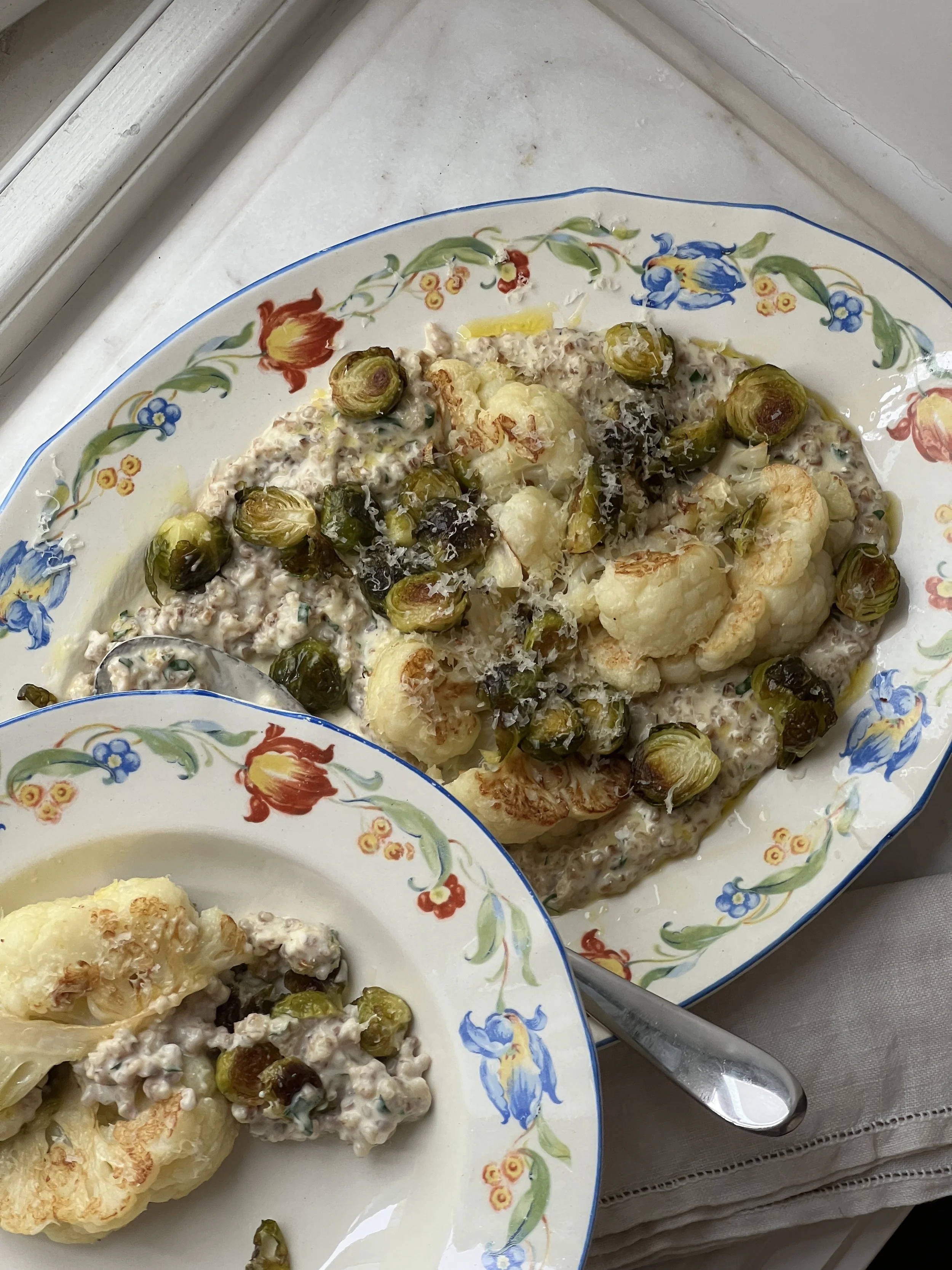 Kremet byggryn med blomkål og rosenkål