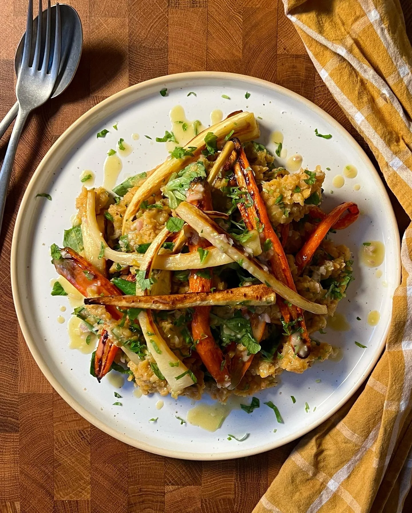 Rotgrønnsaker blir best når de bakes så lenge at de blir karamellisert, nesten brent. Da kommer sødmen ordentlig fram. Her har vi lagt de bakte røttene lagvis med kokte linser. Strengt tatt et måltid i seg selv, men passer også som tilbehør til kjøtt og fisk.