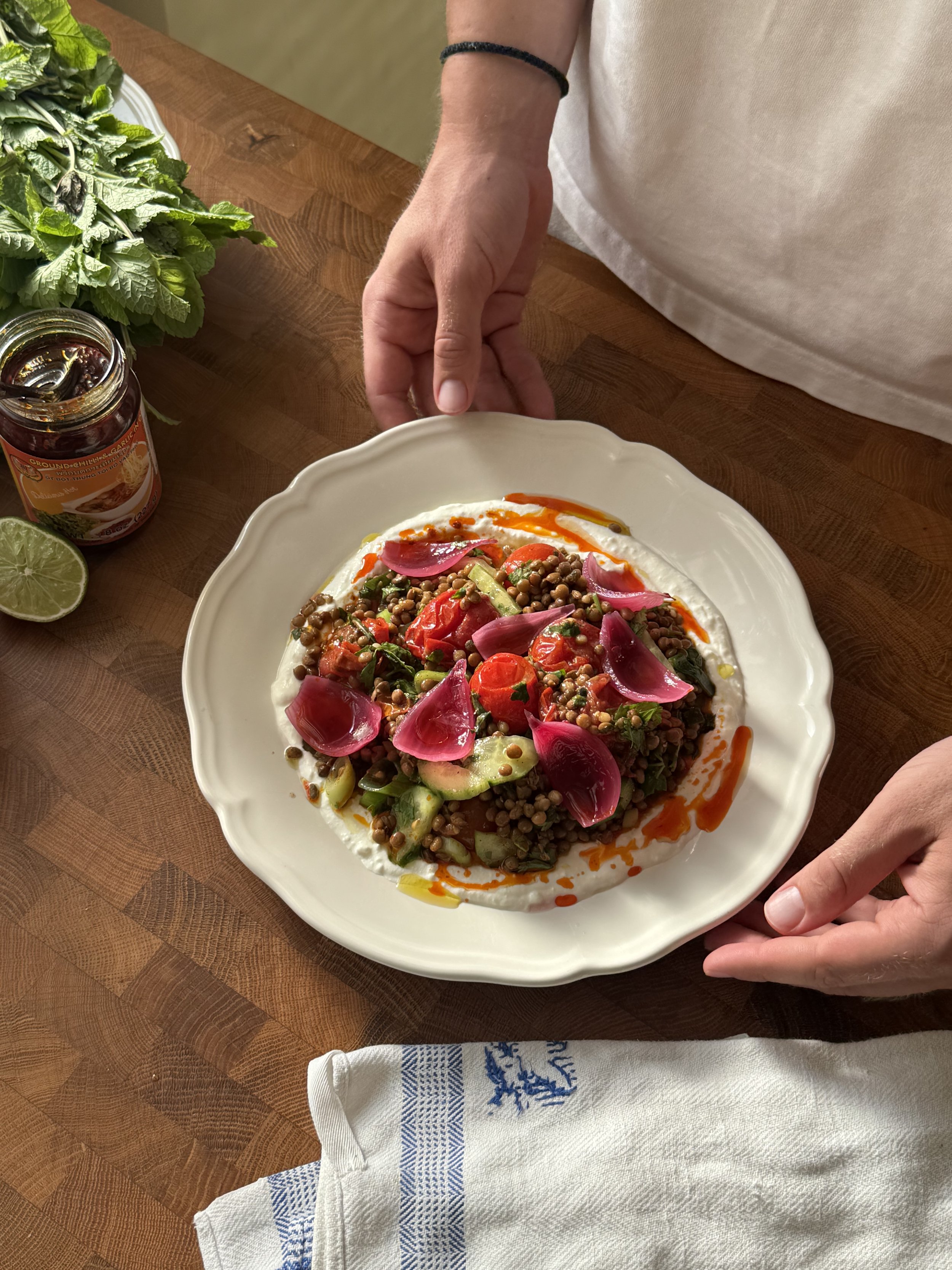 Spre yoghurt utover tallerkenen. Legg linsesalaten oppå. Topp med olivenolje, og gjerne litt chiliolje og syltet rødløk.