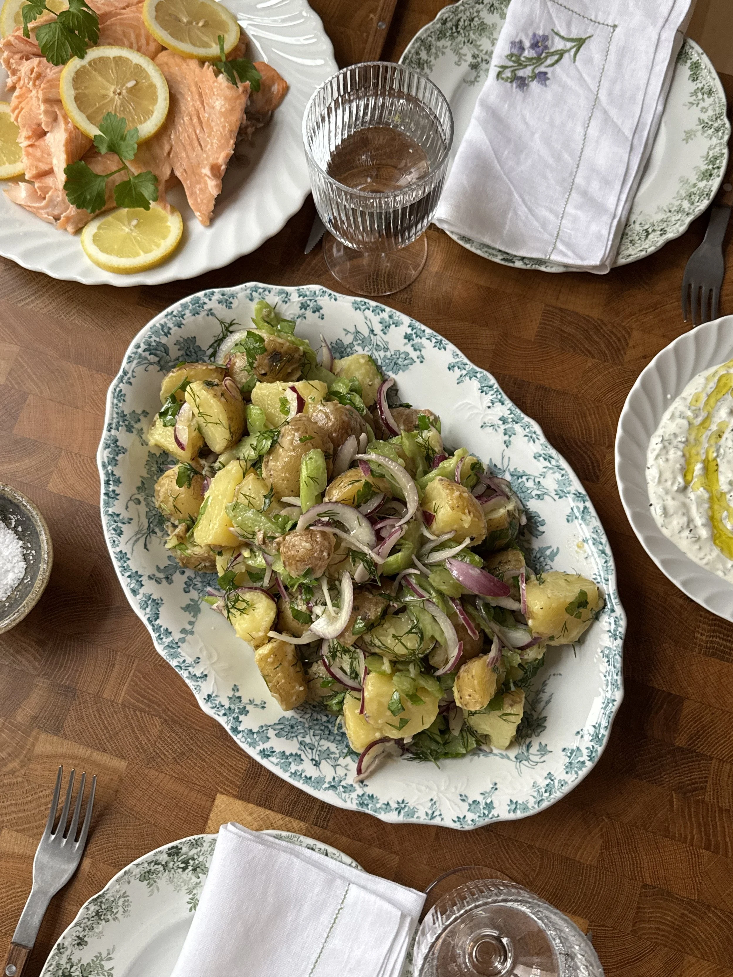En potetsalat kan fort bli en grøtete affære. Trikset for å unngå dette er å ikke koke potetene for lenge og ikke røre for mye. Her har vi vendt inn skiver av stangselleri og rødløk, som skaper en skarp kontrast til de myke potetene. Og friske urter er obligatorisk.