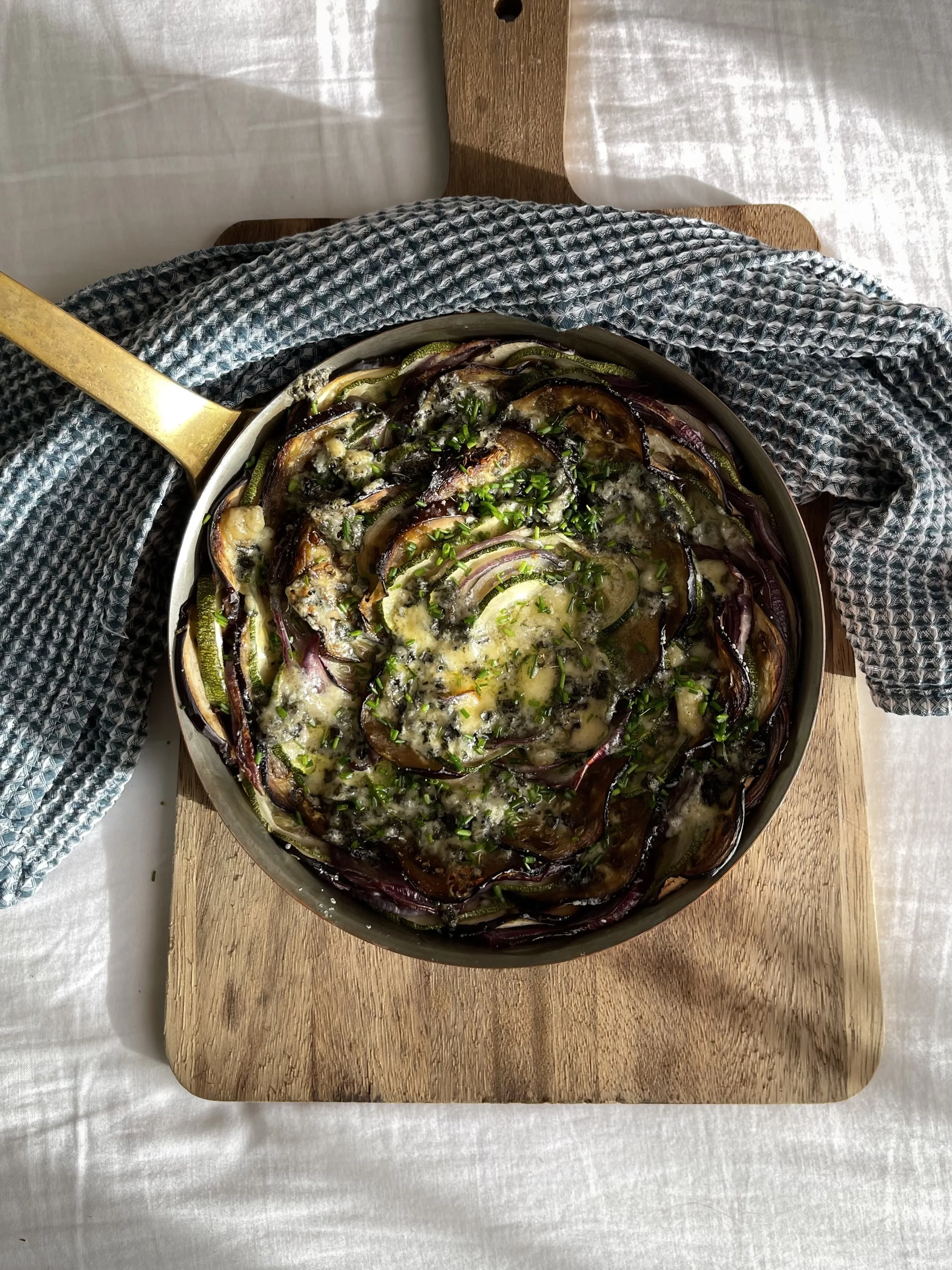 Den skarpe blåmuggosten smelter ned i kriker og kroker og gir ratatouillen et ekstra lag med smak. Denne retten er god for seg selv, med brød til, eller som tilbehør til kjøtt.
