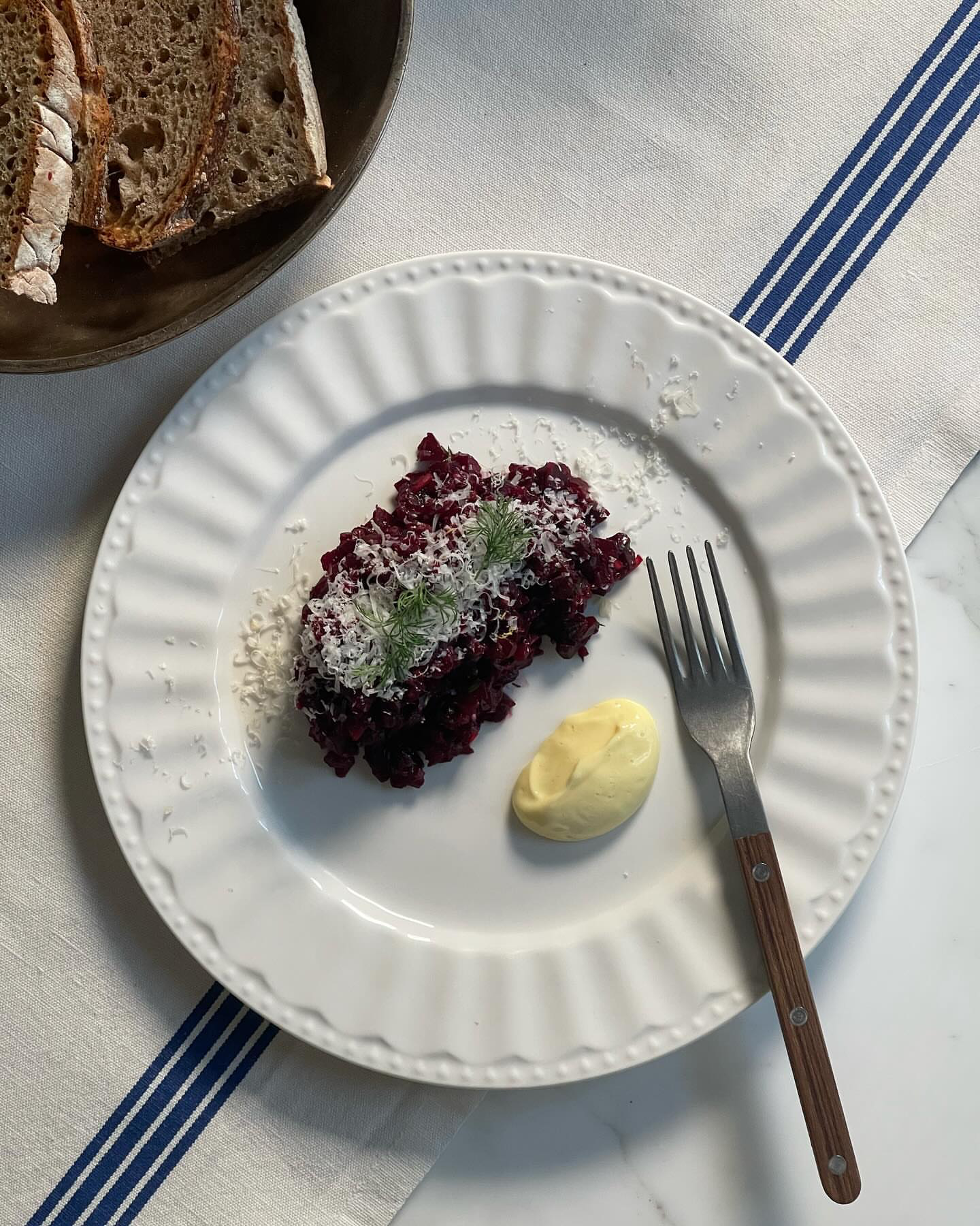 Hvis du vil, kan du bruke små, runde kakeformer til å forme rødbettartaren på tallerkenen. Her har vi gjort det enkelt og bare brukt en skje.