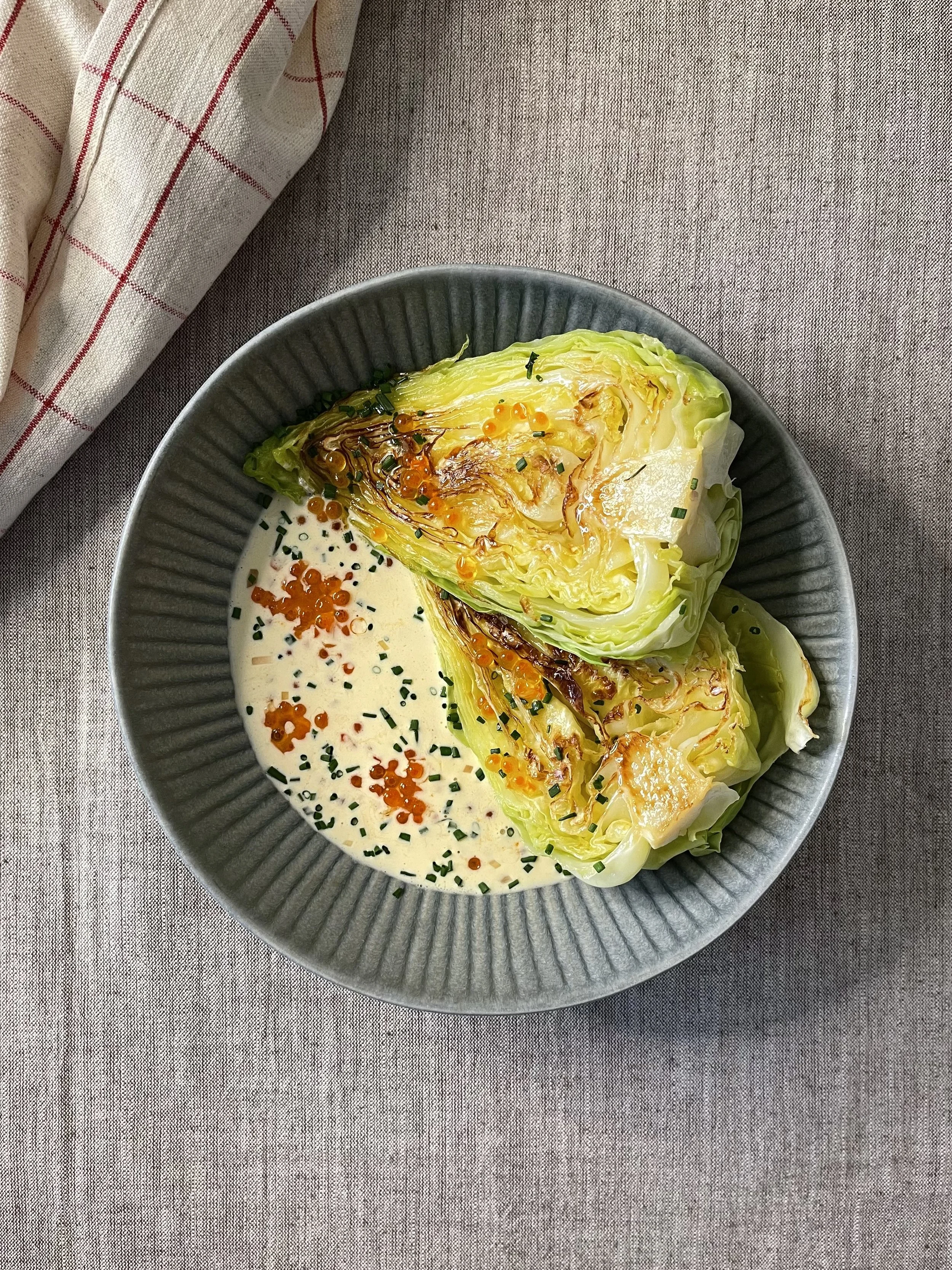 Legg kålen i en dyp skål og hell over fløtesausen. Strø over gressløk og gjerne litt lakserogn.