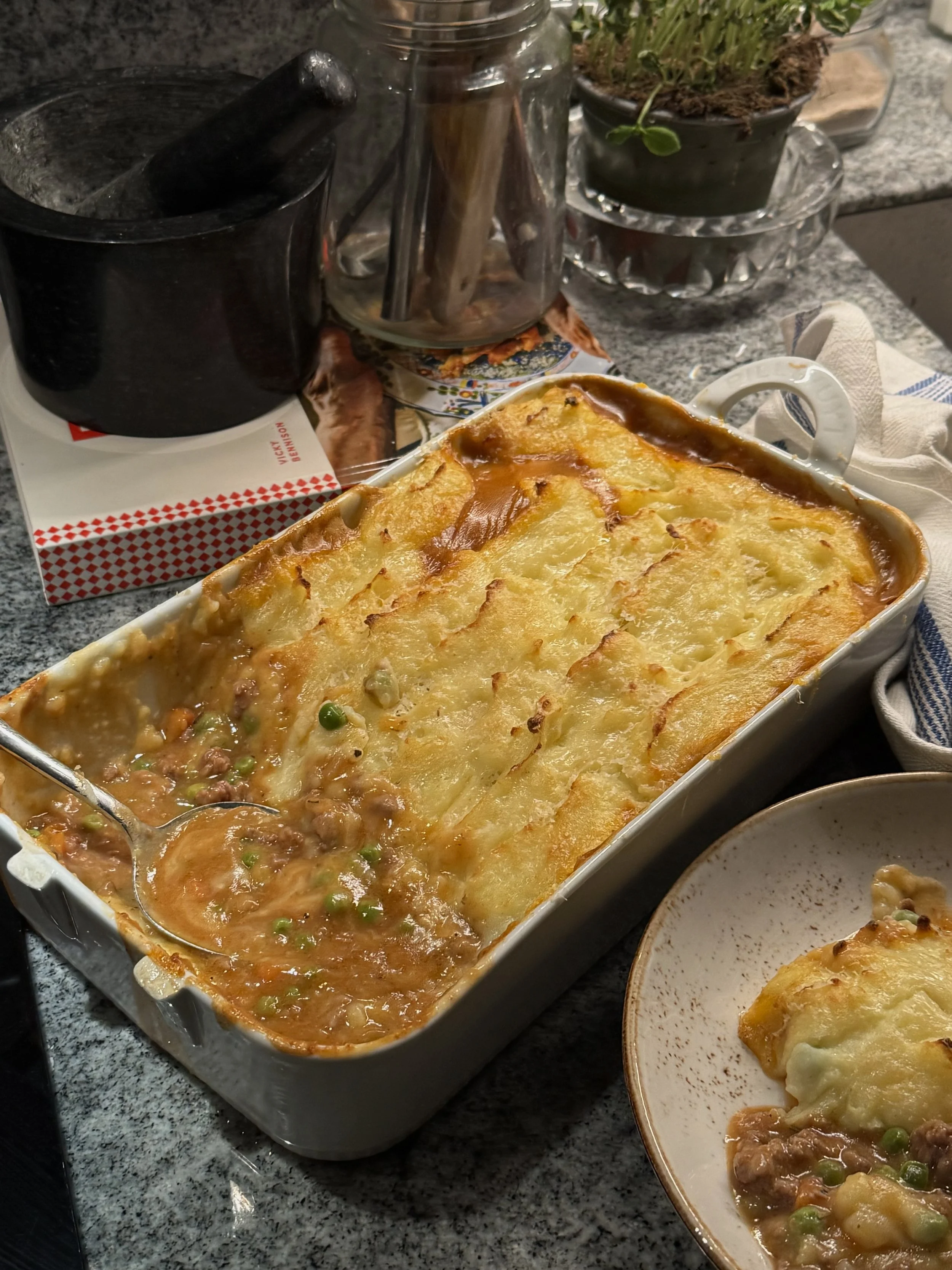 Cottage pie skiller seg kun fra Shepard’s pie ved at den inneholder storfekjøtt i stedet for lammekjøtt. Den er altså litt mildere og mer familievennlig i smaken. I likhet med lasagne blir disse gratinerte formene bare bedre om de får stå i kjøleskapet over natta.