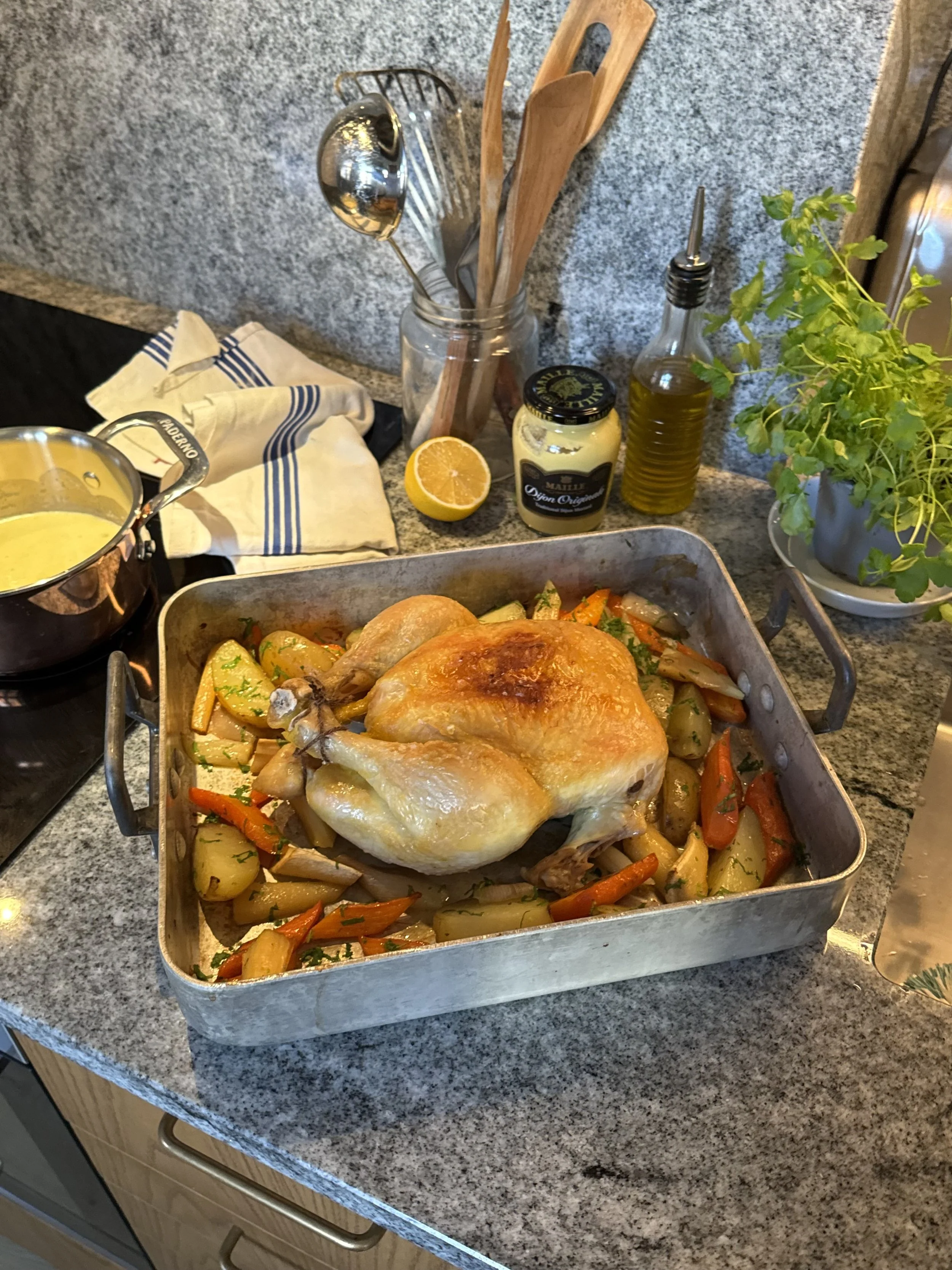 Helstekt kylling med rotgrønnsaker og fløtesaus