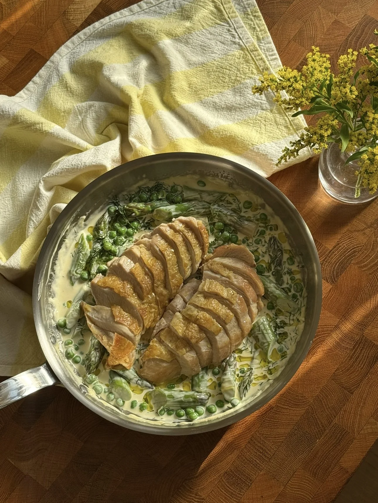 Mens brystene hviler, koker du opp en kjele med saltet vann. Ha i aspargesbitene og la de koke i 2 minutter. Ha i ertene og kok videre i 1 minutt.