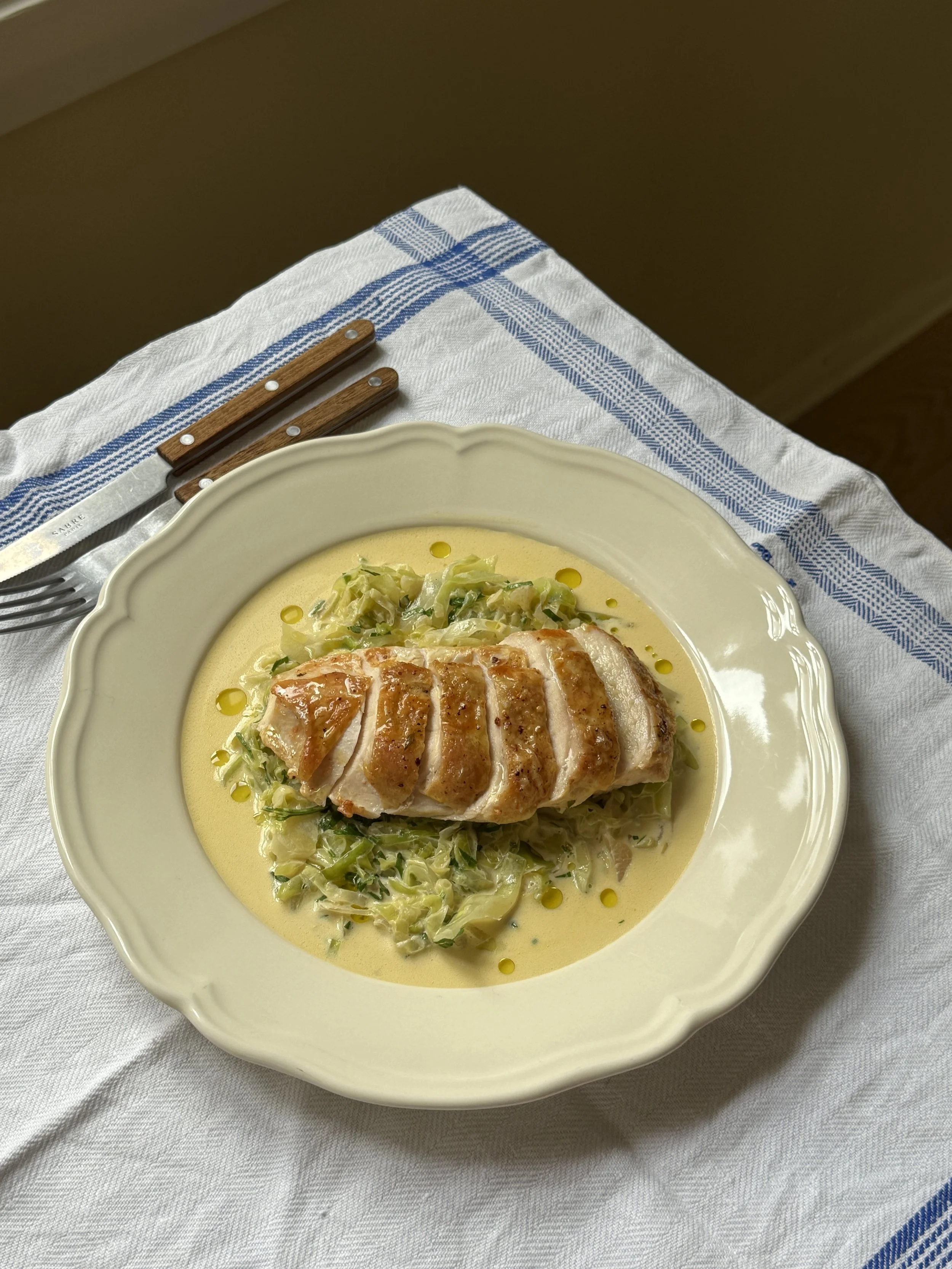 Det er den kremete sommerkålen som er stjerna her. Vi kunne spist kålen for seg selv. Her har vi lagt skiver av gyllent kyllingbryst på toppen, for å gjøre måltidet fullverdig. Du kan også servere kålen med stekt laks eller ørret.