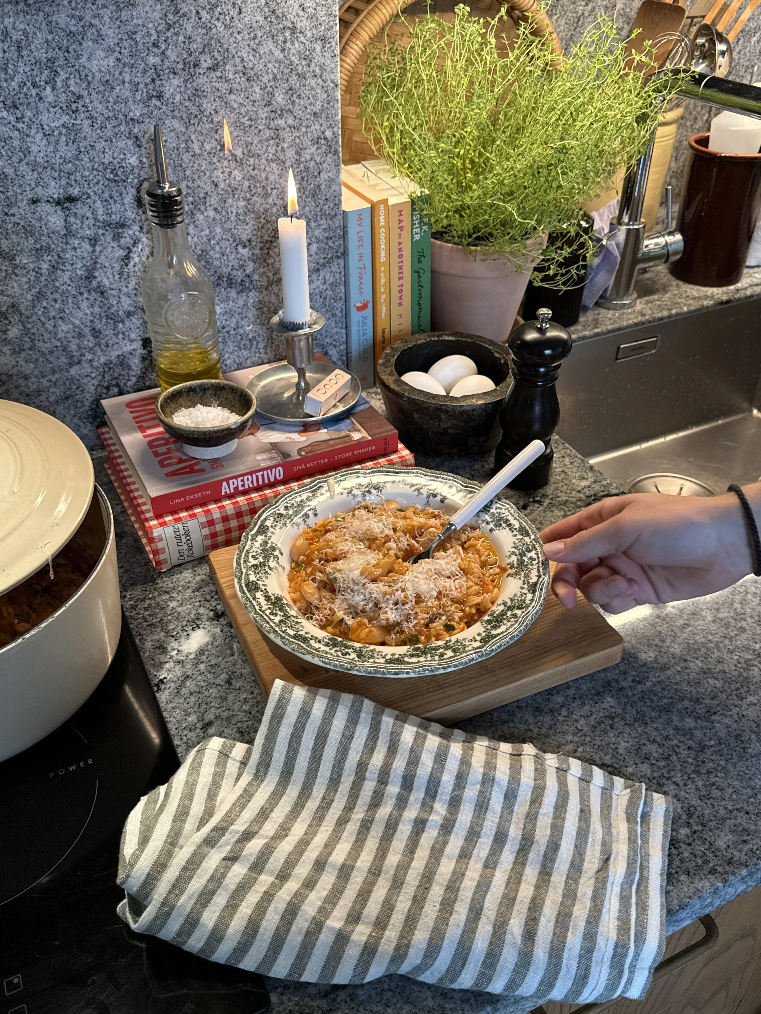 Ha i pastaen og kok videre til pastaen er gjennomkokt, men fortsatt har et lite bitt i midten. Rør i bunnen med en sleiv innimellom, slik at pastaen ikke svir seg fast.