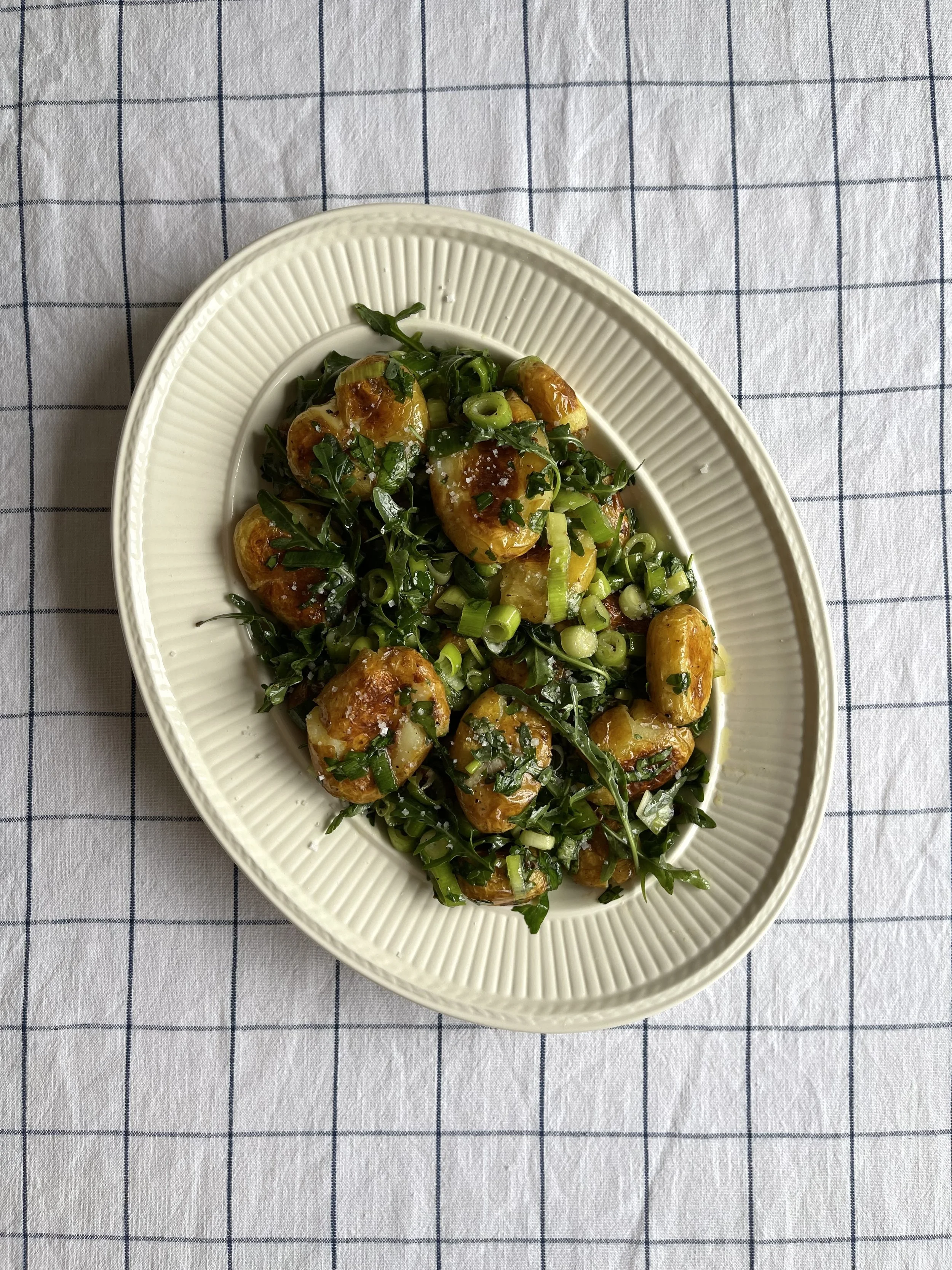 En potetsalat må ikke være bygget på kokte poteter. Bakte poteter gjør seg like godt, om ikke bedre. Her har vi supplert med bakt hvitløk, vårløk og ruccola, som gir potetsalaten et lett og friskt preg. Perfekt til grillmat.