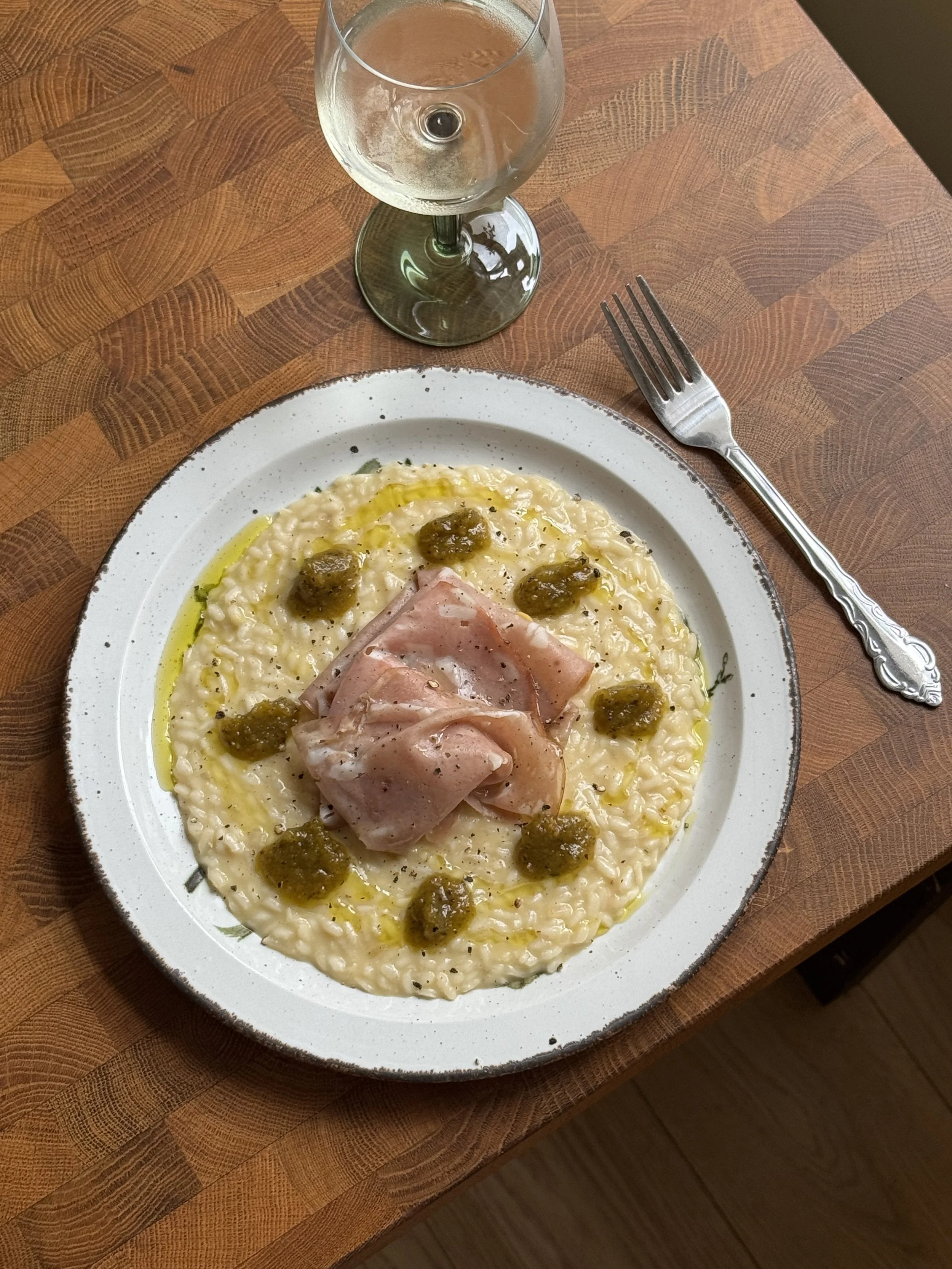 Risotto med mortadella og pesto
