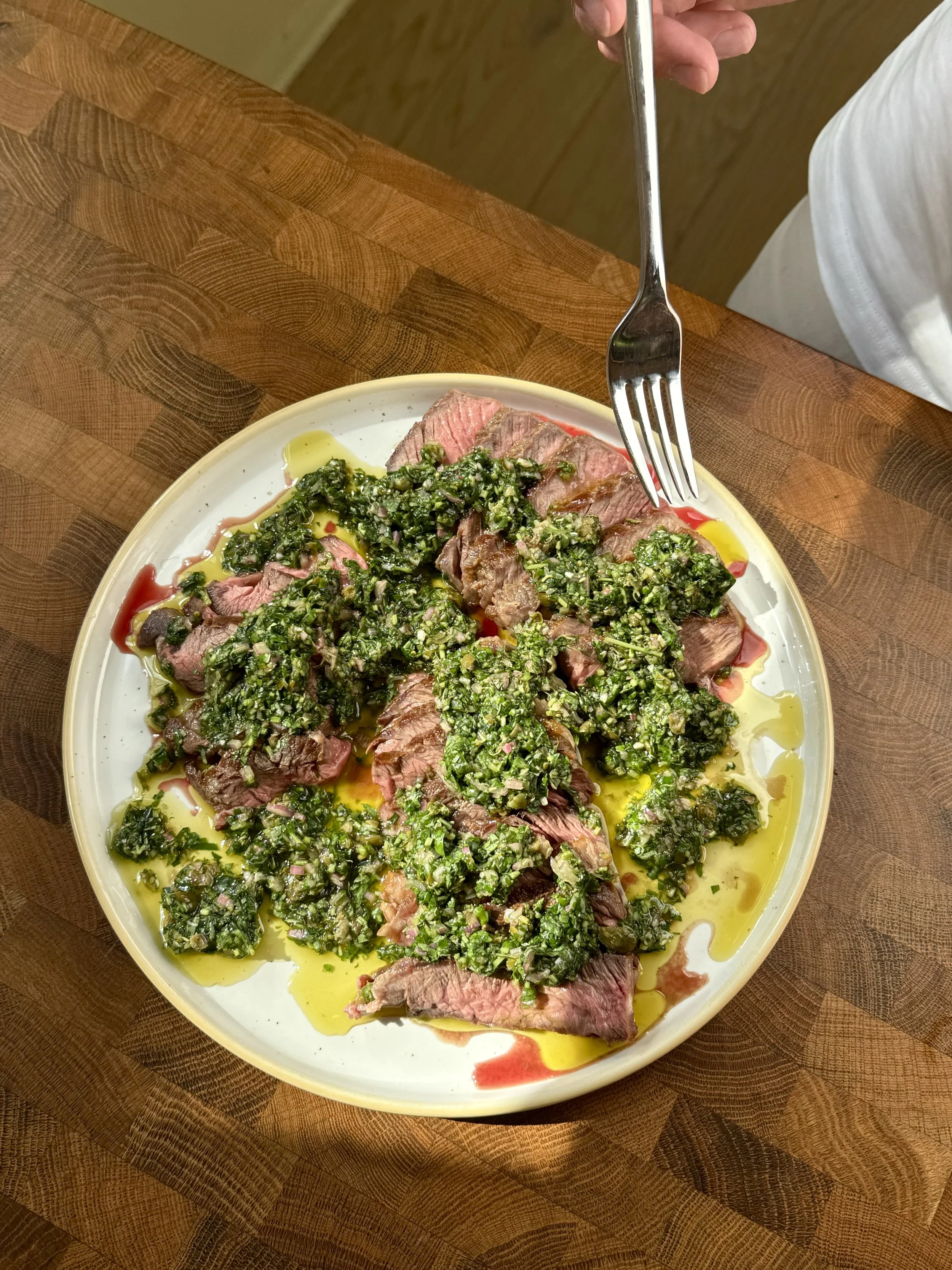 Salsa verde betyr grønn saus, og grønnfargen kommer fra store mengder friske urter. Vi er spesielt glad i kombinasjonen bladpersille, koriander og mynte, men du kan også bruke andre myke urter, som estragon og basilikum. Nydelig til kjøtt og grønnsaker fra grillen.