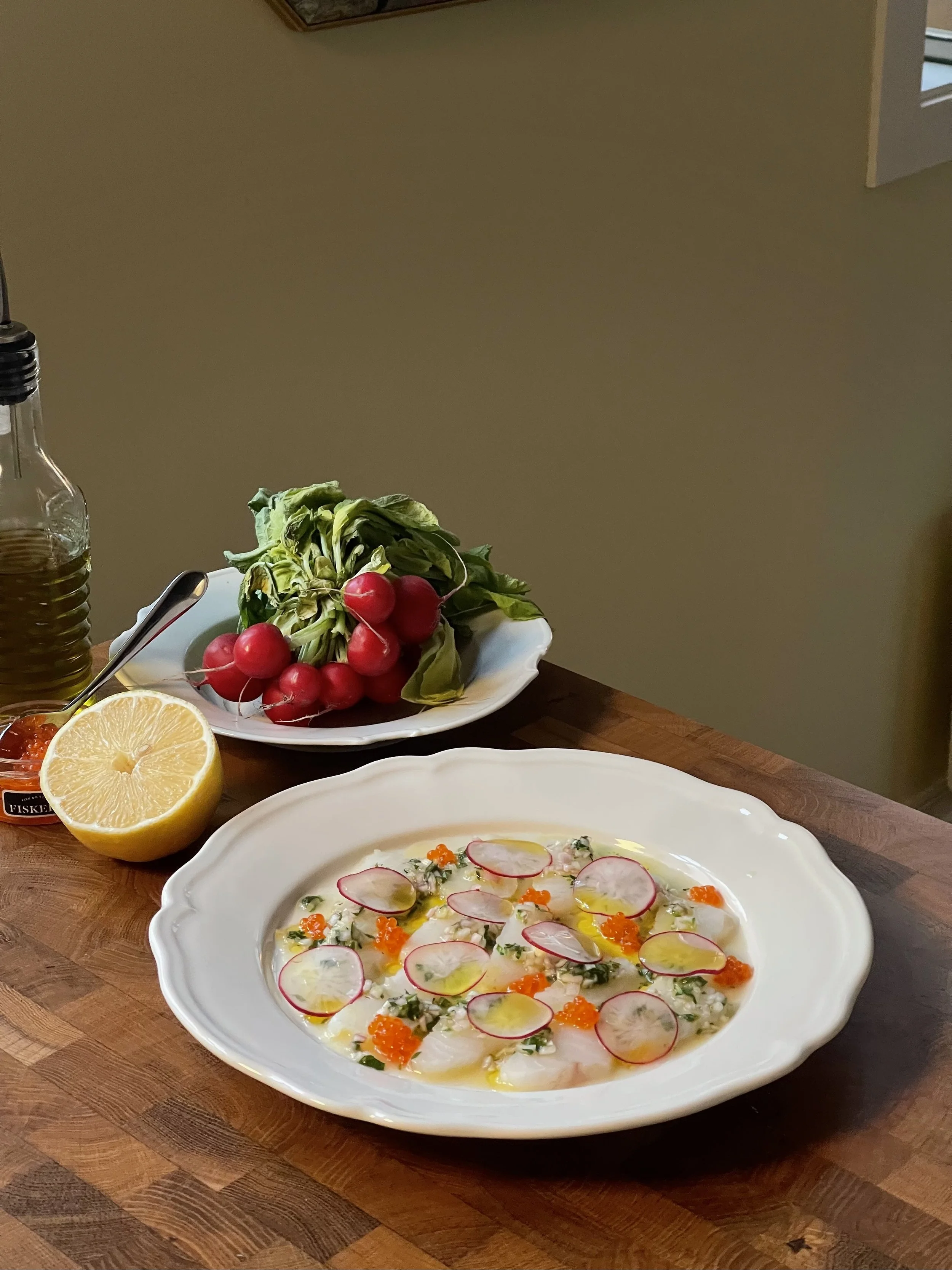 Torsk gjør seg godt i rå, naken tilstand, skåret i nesten gjennomsiktige skiver. Torskecrudoen kler både asiatiske og søramerikanske smaker, men her har vi valgt å holde det rent og hjemlig. Løvtynne skiver av reddik, finhakket sjalottløk, syre fra sitron og salt fra rogn. Enkelt og elegant.